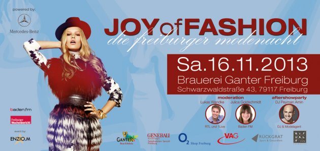 Mit der Freiburger Modenacht „Joy Of Fashion“, in neuen Räumlichkeiten der Brauerei Ganter, präsentiert man ausgewählte Freiburger Geschäfte beziehungsweise deren Sortiment. Besonderes Augenmerk liegt auf den exklusiven, etablierten Boutiquen und Labels aus der Freiburger Innenstadt. Diese zeigen neue Kollektionen und Trends für den Winter. Mit kleidsamen Taschen, Schuhen und Brillen werden die Outfits zu einem stimmigen Ganzen abgerundet. Frisöre ergänzen dies durch passende Stylings und Make-up.